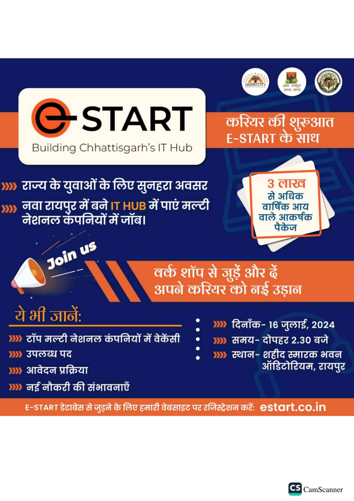 रायपुर । राज्य के युवाओं के लिए रोजगार का सुनहरा अवसर मिलने जा रहा है। सूचना प्रौद्योगिकी के क्षेत्र में रोजगार के अवसर उपलब्ध कराए जाएंगे। युवाओं को नवा रायपुर में खुल रहे आईटी हब में मल्टीनेशनल कंपनियांे से जुड़ने का अवसर मिलने जा रहा है। इसके लिए 16 जुलाई को शहीद स्मारक भवन मंे कार्यशाला आयोजित की गई है। इस कार्यशाला के माध्यम से आई.टी. व संबंधित क्षेत्र में रोजगार के उपलब्ध अवसरों के संबंध में जानकारी प्रदान की जाएगी। इस कार्यशाला में रोजगार उपलब्ध कराने वाली प्लेसमेंट एजेंसी व छात्र हिस्सा लेंगे। इस अवसर का लाभ उठाने के लिए E-START.CO.IN पर पंजीयन कर सकते है