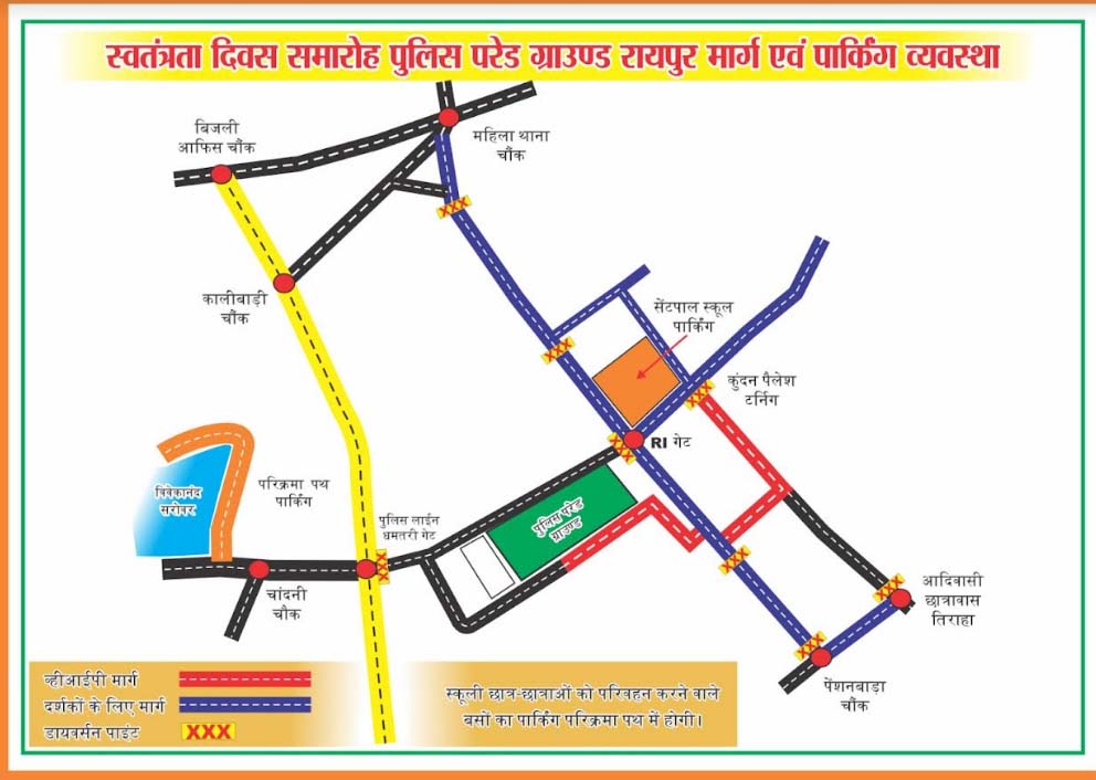 03. स्कूल बसों का मार्ग एवं पार्किग - परेड ग्राउण्ड में छात्र/छात्राओं एवं अन्य संस्थाओं के प्रतिभागियों को लेकर आने वाली बसें पुलिस लाईन पिछला गेट (धमतरी गेट) में छात्र-छात्राओं को उतारकर परिक्रमा पथ पार्किंग विवेकानंद सरोवर में बसों को पार्क करेंगे।