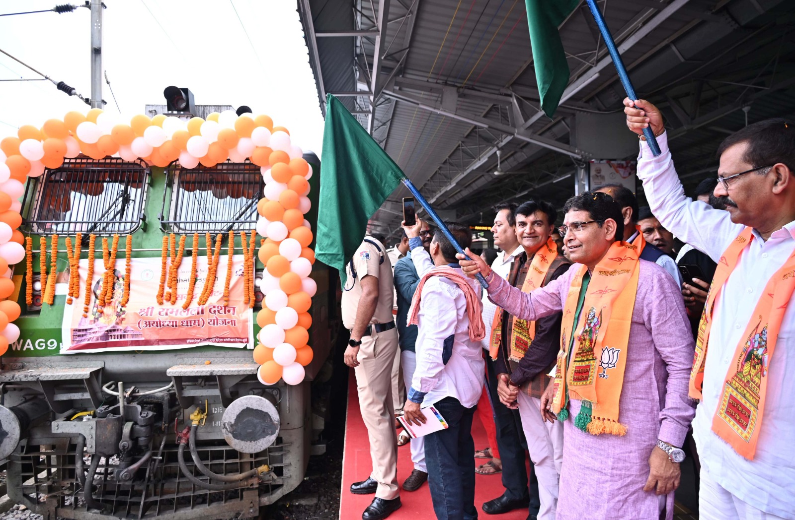 रायपुर / मुख्यमंत्री श्री विष्णुदेव साय के पहल पर शुरू की गई श्री रामलला दर्शन योजना के तहत चलाई जा रही विशेष ट्रेन मंगलवार को रायपुर रेल्वे स्टेशन के प्लेटफार्म नंबर-07 से रवाना हुई। राजस्व मंत्री श्री टंक राम वर्मा ने हरी झंडी दिखाकर ट्रेन को रवाना किया। इस विशेष ट्रेन से 850 श्रद्धालुओं का जत्था अयोध्या धाम के लिए रवाना हुआ। इस यात्रा से श्रद्धालुओं में भारी उत्साह है। श्रद्धालुगण भगवान राम का जय-जयकार करते हुए अयोध्या धाम के लिए निकल चुके हैं। ट्रेन में श्रद्धालु भजन-कीर्तन करते हुए भक्तिमय माहौल में श्री रामलला के दर्शन को जा रहे है।