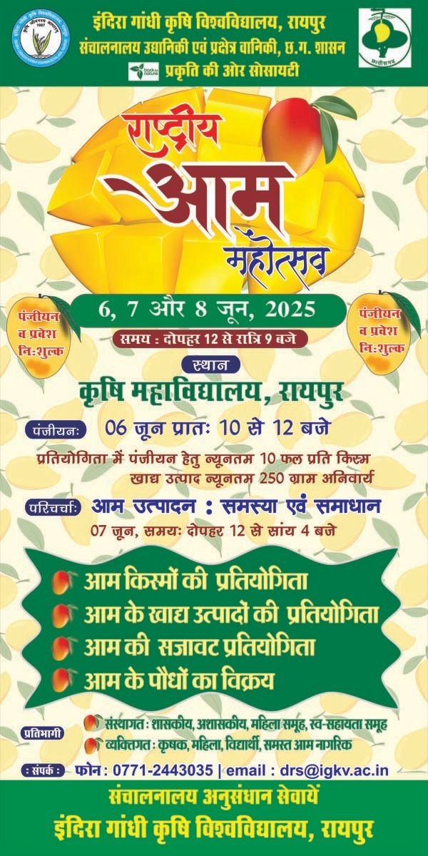 रायपुर। इंदिरा गांधी कृषि विश्वविद्यालय, संचालनालय उद्यानिकी एवं प्रक्षेत्र वानिकी, छत्तीसगढ़ शासन तथा प्रकृति की ओर सोसायटी के संयुक्त तत्वावधान में दिनांक 6, 7 एवं 8 जून को कृषि महाविद्यालय परिसर रायपुर में ‘‘फलों के राजा’’ आम के राष्ट्रीय महोत्सव का आयोजन किया जा रहा है। राष्ट्रीय आम महोत्सव में आम की 200 से अधिक किस्मों एवं आम से बने 56 व्यंजनों का प्रदर्शन किया जायेगा। इस कार्यक्रम में आम की विभिन्न किस्मों की प्रतियोगिता आयोजित की जा रही है जिसमें छत्तीसगढ़ एवं देश के विभिन्न राज्यों के आम उत्पादक शामिल होंगे। अवसर पर आम से बने विभिन्न व्यंजनों की प्रतियोगिता भी आयोजित है। आम की सजावट प्रतियोगिता भी आयोजित की जा रही है जिसमें विद्यालयीन एवं महाविद्यालयीन विद्यार्थी, महिलाएं तथा अन्य सामान्यजन भी पंजीयन कर भागीदारी कर सकते है। इस महोत्सव में पंजीयन एवं प्रवेश पूर्णतया निःशुल्क है। राष्ट्रीय आम महोत्सव में संस्थागत एवं व्यक्तिगत प्रतियोगी भी सहभागी हो सकते हैं।
