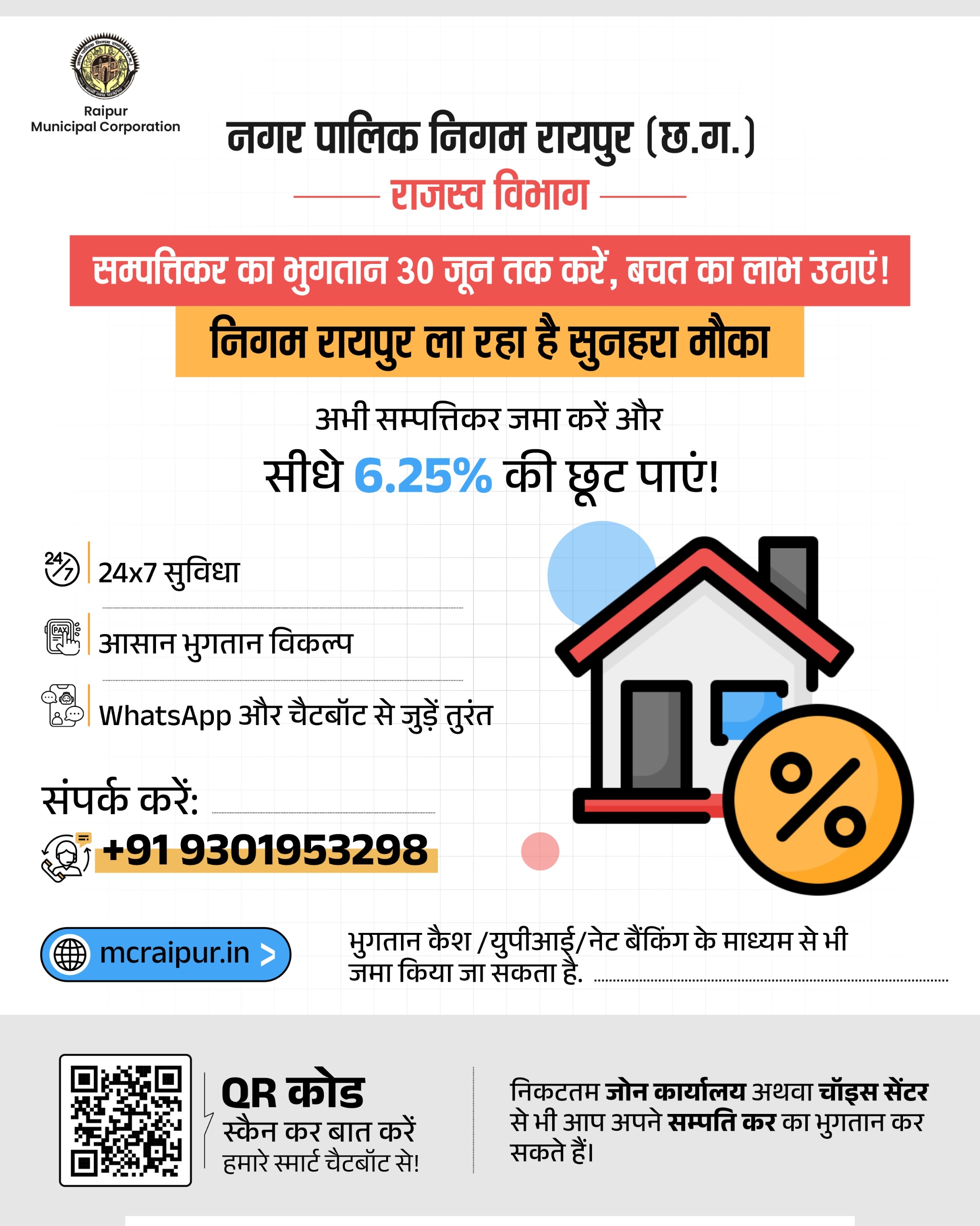 व्हाट्सएप्प, क्यूआरकोड, चैटबॉट आदि उपलब्ध विकल्पों से सम्पतिकर का पूर्ण भुगतान करने वालों को 6. 25 प्रतिशत की छूट