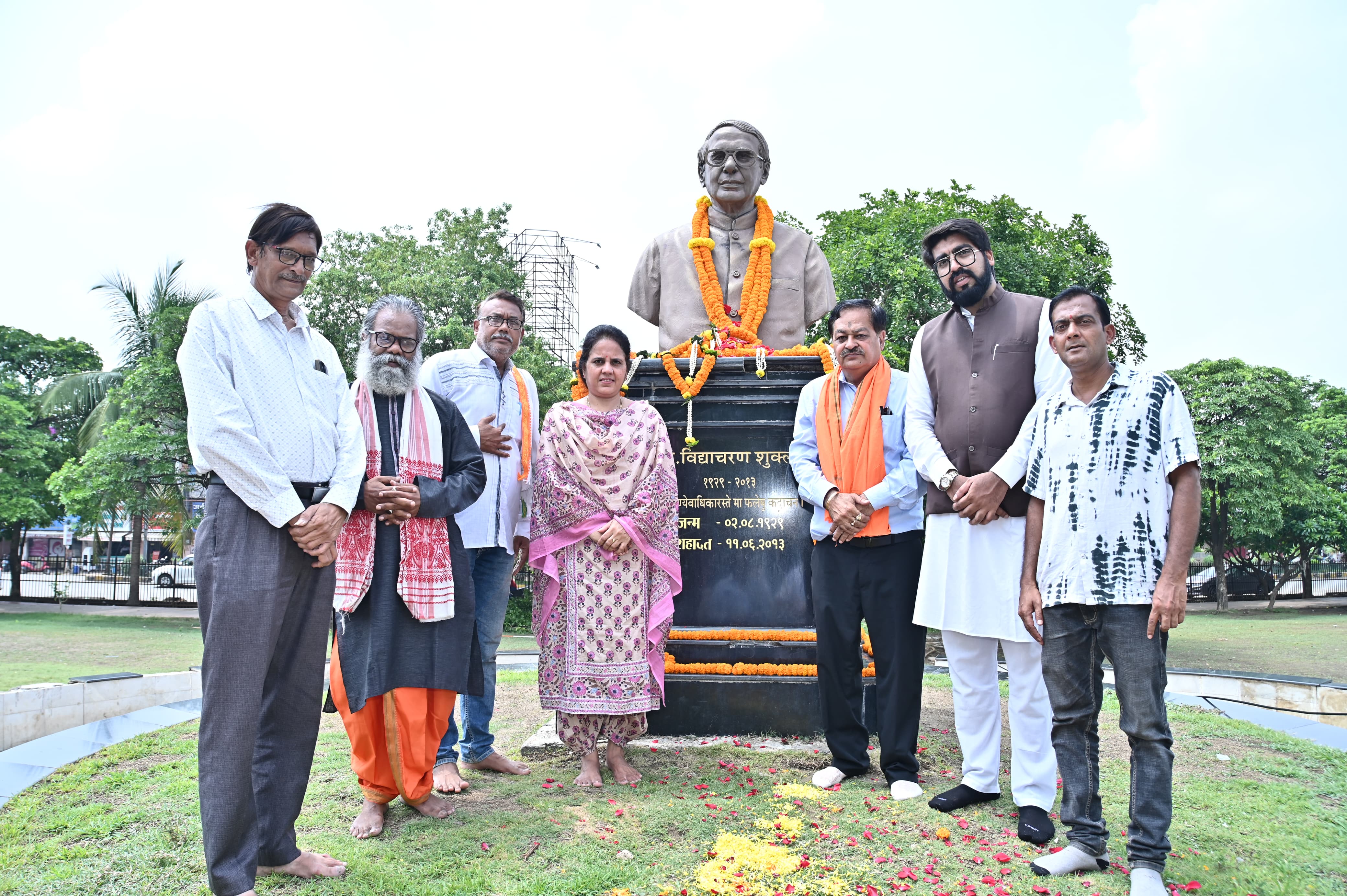 रायपुर - आज पूर्व केन्द्रीय मन्त्री शहीद पण्डित विद्याचरण शुक्ल की 12वीं पुण्यतिथि पर उन्हें नमन करने नगर पालिक निगम रायपुर के संस्कृति विभाग के तत्वावधान में नगर निगम जोन 4 के सहयोग से राजधानी शहर में रायपुर नगर पालिक निगम मुख्यालय भवन महात्मा गाँधी सदन के सामने नगर निगम के शहीद पण्डित विद्याचरण शुक्ल उद्यान परिसर स्थित उनकी मूर्ति के समक्ष रखे गए संक्षिप्त पुष्पांजलि आयोजन में पहुंचकर राजधानी शहर की प्रथम नागरिक नगर पालिक निगम रायपुर की महापौर श्रीमती मीनल चौबे ने उन्हें समस्त नगरवासियों की ओर से सादर नमन करते हुए मूर्ति स्थल पर आदरांजलि अर्पित की. नगर निगम संस्कृति विभाग के अध्यक्ष श्री अमर गिदवानी, पूर्व पार्षद श्री मनोज कंदोई, सामाजिक कार्यकर्त्ता सर्वश्री अनुभव चरण शुक्ला, प्रमोद तिवारी, नवीन चंद्राकर, जोन 4 सहायक अभियंता श्री दीपक देवांगन, गणमान्यजनों, महिलाओं, सामाजिक कार्यकर्त्ताओं, नवयुवकों, आमजनों ने शहीद पण्डित विद्याचरण शुक्ल को उनकी 12वीं पुण्यतिथि पर मूर्ति स्थल पर नमन किया.