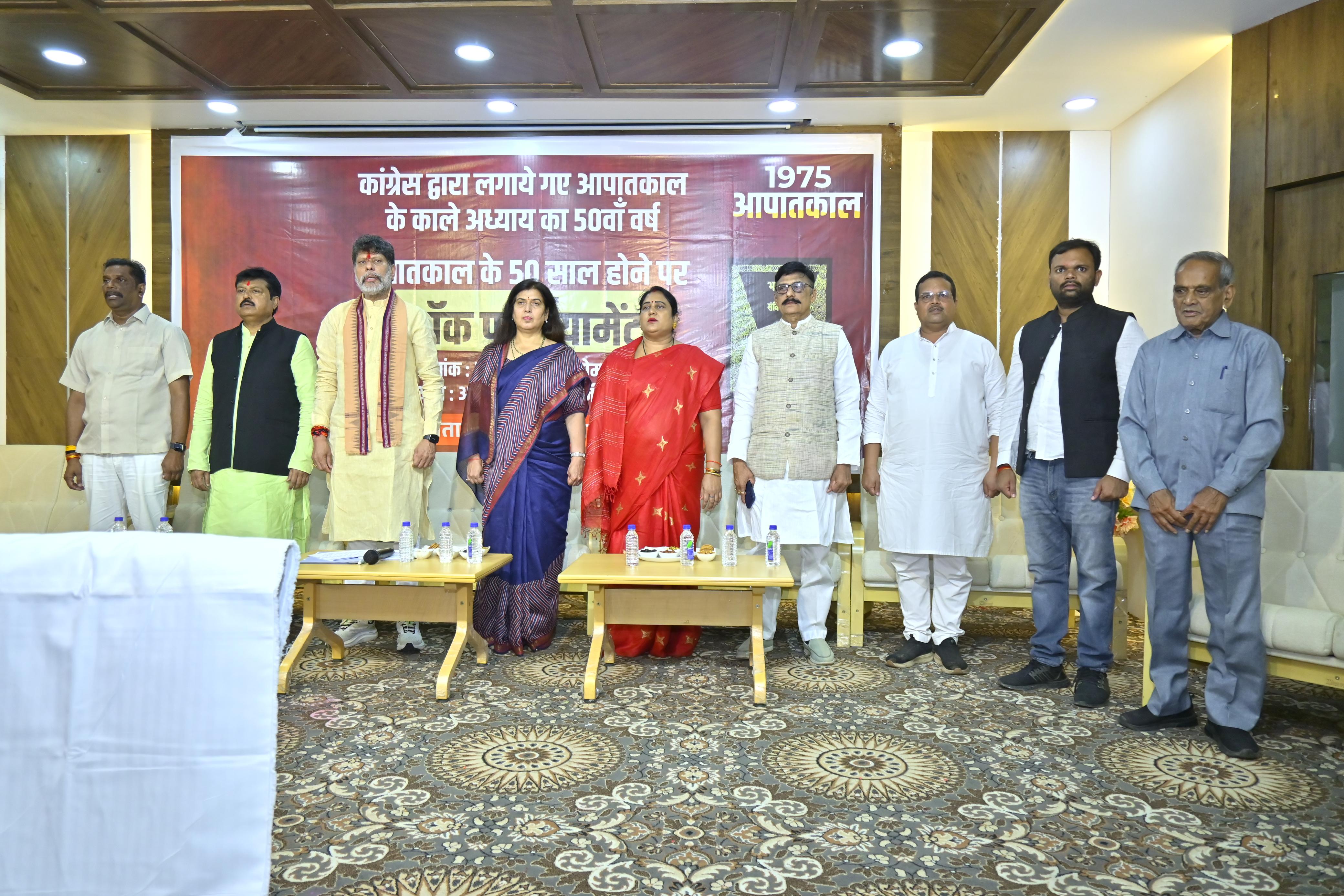 रायपुर। भारतीय जनता पार्टी महिला मोर्चा द्वारा मॉक पार्लियामेंट कार्यक्रम का आयोजन छत्तीसगढ़ी दाऊ अग्रसेन भवन पुरानी बस्ती में संपन्न हुई। मॉक पार्लियामेंट कार्यक्रम में भाजपा राष्ट्रीय उपाध्यक्ष सुश्री सरोज पाण्डेय, भाजपा प्रदेश अध्यक्ष किरण सिंह देव, प्रदेश महामंत्री संजय श्रीवास्तव, भाजपा महिला मोर्चा अध्यक्ष शालिनी राजपूत, मीसाबंदी संघ अध्यक्ष दिवाकर तिवारी, भाजपा मीडिया सह प्रभारी अनुराग अग्रवाल की उपस्थिति में भाजपा राष्ट्रीय उपाध्यक्ष सुश्री सरोज पांडेय ने सदन को संबोधित करते हुए कहा कि देश में आपातकाल 25 जून को मध्य रात्रि को लगा दिया गया। लगाने का कोई कारण नहीं रहा आपातकाल इसलिए लगाया गया क्योंकि उस समय सत्ता में प्रधानमंत्री इंदिरा गांधी के खिलाफ कोर्ट का निर्णय हुआ और उस समय प्रधानमंत्री इंदिरा गांधी थी इसलिए उन्हें अपनी पद छोड़ना पड़ता। अपने पद को बचाने के लिए देश में इंदरा गांधी ने आपातकाल लगाया। आपातकाल लागू कर इंदिरा गांधी ने सत्ता का दुरूपयोग करते हुए भारत के संविधान में संशोधन किया। कांग्रेस पार्टी ने लोकतंत्र के हत्या की, 1 लाख से ज्यादा लोगों को जेल के अंदर डाल दिया। जिसमें विपक्षी दल के नेता भी थे, भारत में रहने वाले नागरिक भी थे। लोगों की जबदस्ती नसबंदी कराया गया। उस समय लोगों को जेल में डालकर दर्दनाक यातनाएं दी गई।