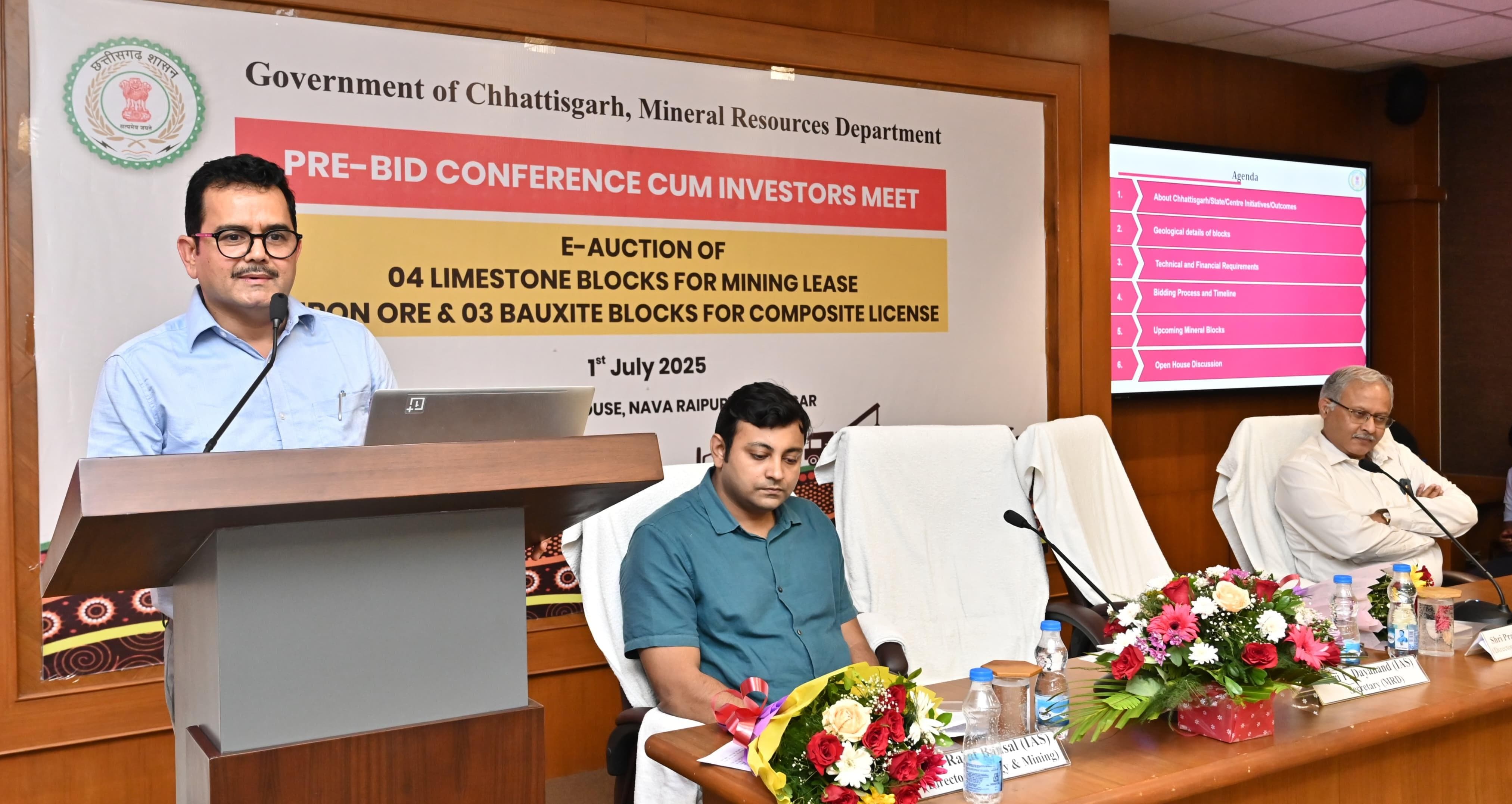 रायपुर /मुख्यमंत्री श्री विष्णु देव साय के मार्गदर्शन में छत्तीसगढ़ में खनिज क्षेत्र में एक महत्वपूर्ण पहल करते हुए चूना पत्थर, लौह अयस्क और बॉक्साइट खनिज के नए ब्लॉकों की ई-नीलामी प्रक्रिया प्रारंभ हो गई है। इसी क्रम में आज नवा रायपुर अटल नगर में निवेशकों के लिए प्री-बिड सम्मेलन का आयोजन किया गया। इस प्री-बिड सम्मेलन का उद्देश्य राज्य की समृद्ध खनिज संपदा को औद्योगिक निवेश के लिए उपलब्ध कराना, स्थानीय विकास को बढ़ावा देना तथा पारदर्शी ई-नीलामी प्रणाली के माध्यम से निवेशकों को आकर्षित करना है।