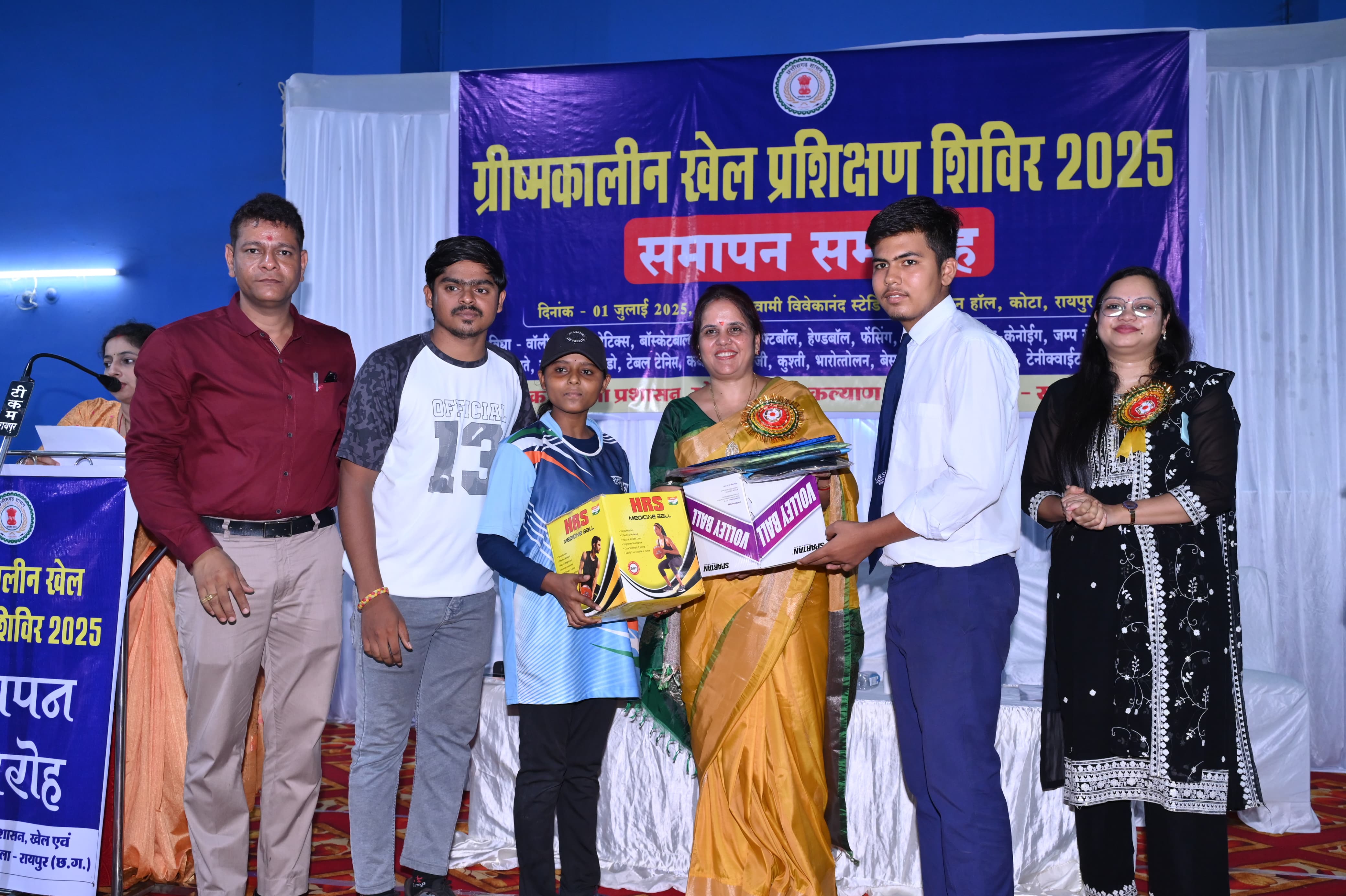 रायपुर/ स्वामी विवेकानंद स्टेडियम कोटा रायपुर में खेल एवं युवा कल्याण विभाग द्वारा ग्रीष्मकालीन खेल प्रशिक्षण शिविर दिनांक 15 मई से 13 जून 2025 तक 30 दिवसीय शिविर का आयोजन किया गया। शिविर का समापन दिनांक 01 जुलाई 2025 को संध्या 4:00 बजे स्वामी विवेकानंद स्टेडियम कोटा रायपुर में श्रीमती मीनल चौबे महापौर, नगर पालिका निगम रायपुर के आतिथ्य में सम्पन्न हुआ। आयोजन में श्रीमती अभिलाषा पैंकरा, अपर कलेक्टर, सहायक संचालक खेल एवं खेल संघ/संस्थान के सदस्य, व्यायाम शिक्षक, प्रशिक्षक, खिलाड़ी शामिल हुए। श्री प्रवेश जोशी, खेल अधिकारी द्वारा प्रतिवेदन पाठन किया गया।