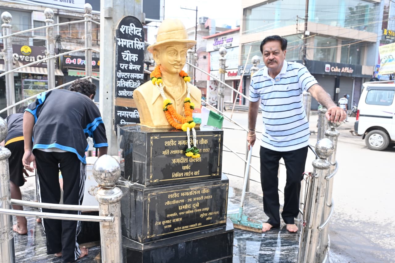 ~निगम संस्कृति विभाग अध्यक्ष अमर गिदवानी, पार्षद राजेश गुप्ता, श्री महेन्द्र औसर ने महापुरूषों की मूर्तियों और चौराहो की झाडू लगाकर सफाई श्रमदान कर की