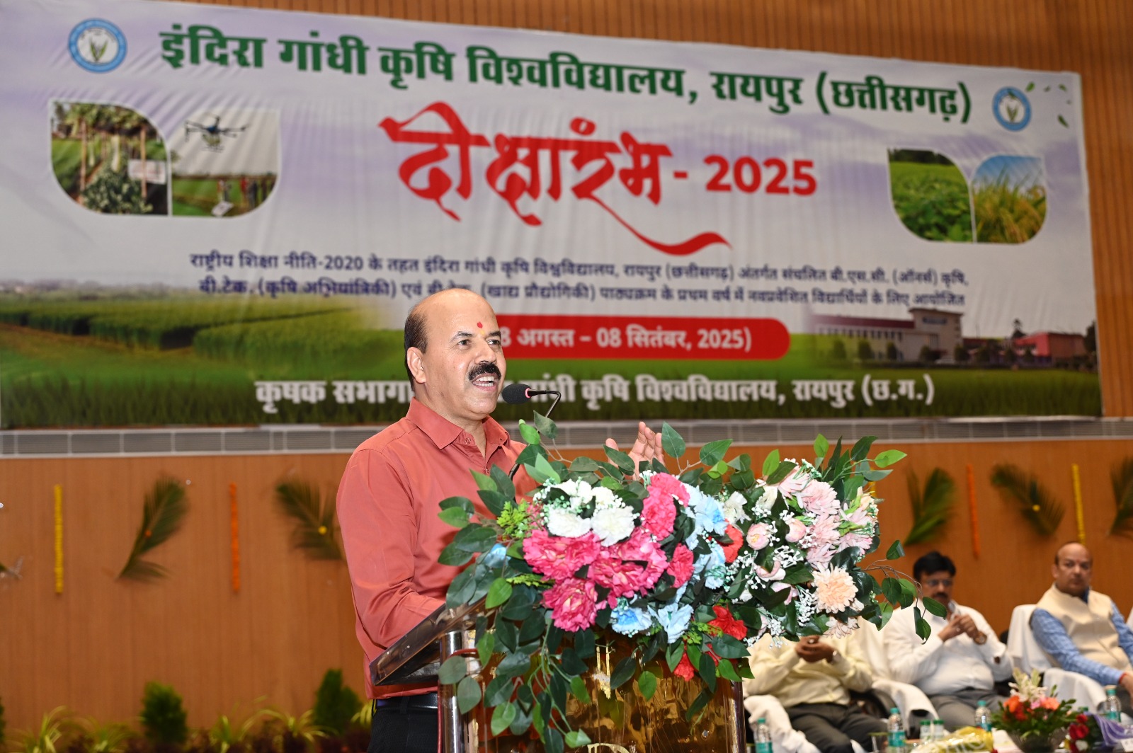समारोह की अध्यक्षता करते हुए इंदिरा गांधी कृषि विश्वविद्यालय के कुलपति डॉ. गिरीश चंदेल ने कहा कि राष्ट्रीय शिक्षा नीति 2020 के तहत इस वर्ष सभी महाविद्यालयों में नव प्रवेशित विद्यार्थियों के लिए दीक्षा आरंभ प्रेरण कार्यक्रम आयोजित किया गया है। उन्होंने कहा कि इंदिरा गांधी कृषि विश्वविद्यालय द्वारा विगत वर्ष से नवीन राष्ट्रीय शिक्षा नीति को लागू किया गया है तथा उसी के अनुरूप पाठ्यक्रमों तथा अध्ययन प्रणाली को विकसित किया गया है। यह विश्वविद्यालय प्रदेश का एक प्रमुख संस्थान है जो कृषि शिक्षा, अनुसंधान और प्रसार में उत्कृतष्टता के लिए समर्पित है। कृषि महाविद्यालयों में हम कृषि में नवाचार, स्थिरता और शैक्षणिक उत्कृष्टता को बढ़ावा देने के लिए प्रतिबद्ध है। हमारे कार्यक्रम राष्ट्र और वैश्विक समुदाय दोनों की उभरती आवश्यकताओं को पूरा करने के लिए सोच-समझकर डिजाइन किए गए हैं। अत्याधुनिक अनुसंधान सुविधओं, व्यावहारिक शिक्षण अनुभवों और विशेषज्ञों के एक प्रतिष्ठित संकाय के साथ हम एक गतिशील वातावरण प्रदान करते हैं जो ज्ञान, रचनात्मकता और नेतृत्व को पोषित करता है। यह दीक्षारंभ कार्यक्रम हमारे विश्वविद्यालय की जीवंत शैक्षणिक और शोध संस्कृति की एक झलक प्रस्तुत करने हेतु आयोजित किया गया है। यह दीक्षारंभ कार्यक्रम आप सभी नव प्रवेशित छात्र-छात्राओं को विश्वविद्यालय के विभिन्न शैक्षणिक नियमों, राष्ट्रीय शिक्षा नीति-2020, छात्रवृत्ति/फेलोशिप, यूजीसी रैगिंग विरोधी नीति, उच्च शिक्षण संस्थानों में महिला कर्मचारियों और छात्राओं के यौन उत्पीड़न की रोकथाम, निषेध और निवारण, प्रधानमंत्री-विद्यालक्ष्मी योजना, राष्ट्रीय सेवा योजना (एनएसएस), राष्ट्रीय कैडेट कोर (एनसीसी), सांस्कृतिक गतिविधियों, खेलकूद एवं अंततः कृषि स्नातकों के लिए करियर के अवसर के विषय में जानकारी प्रदान करने हेतु आयोजित किया गया है। डॉ. चंदेल ने कहा कि नवप्रवेशित विद्यार्थियों के लिए आयोजित 14 दिवसीय प्रेरण कार्यक्रम दीक्षा आरंभ के दौरान विद्यार्थियों को उनके द्वारा पढ़े जाने वाले पाठ्यक्रमों, कोर्स क्रेडिट प्रणाली, सूचना प्रणाली, परीक्षा प्रणाली, छात्र वृत्ति, विभिन्न शुल्क, हॉस्टल सुविधा, लाइब्रेरी सुविधा, कृषि अनुसंधान एवं विस्तार कार्य, व्यक्तित्व विकास, उद्यमिता विकास आदि के संबंध में विशेषज्ञों द्वारा जानकारी दी जाएगी। इसके साथ ही नवप्रवेशित विद्यार्थियों को विभिन्न विभागों, प्रयोगशालाओं, लाइब्रेरी तथा अनुसंधान प्रक्षेत्र का भ्रमण भी करवाया जाएगा। दीक्षा आरंभ कार्यक्रम के प्रभारी तथा कृषि महाविद्यालय रायपुर के अधिष्ठाता डॉ. आरती गुहे ने स्वागत भाषण देते हुए दीक्षा आरंभ कार्यक्रम के बारे में 