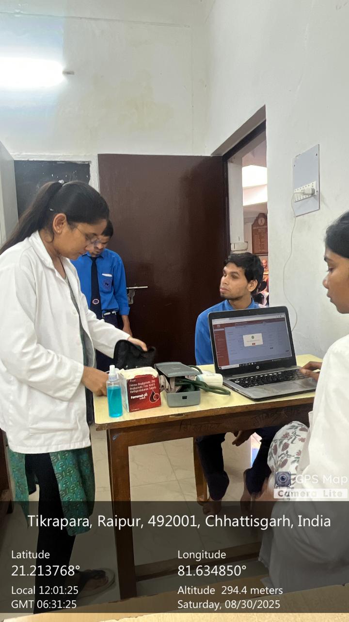 रायपुर। मुख्यमंत्री स्लम स्वास्थ्य योजना के अंतर्गत एमएमयू-2 दाई दीदी क्लिनिक द्वारा शासकीय दृष्टि एवं श्रवण बधितार्थ विद्यालय, मठपुरेना में एक दिवसीय विशेष स्वास्थ्य शिविर का आयोजन किया गया। इस शिविर में विद्यालय के बच्चों का व्यापक स्वास्थ्य परीक्षण किया गया, जिसमें कुल 73 बच्चों की जाँच की गई।