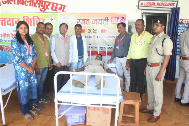बिलासपुर /केन्द्रीय जेल में छत्तीसगढ़ में 3 अक्टूबर से 10 अक्टूबर 2025 तक छत्तीसगढ़ राज्य निर्माण की रजत जयंती के अवसर पर प्रतिदिन जेल सुधारात्मक कार्यक्रम का आयोजन किया जा रहा है। इसी क्रम में केन्द्रीय जेल में रक्तदान शिविर का आयोजन किया गया, जिसमें सिम्स अस्पताल से ब्लड सेंटर स्टाफ से डॉ मनोज क्षत्रिय, डॉ असीम आनंद मसीह, श्री विवेक कुमार शर्मा, श्री किशोर सिदार, श्री सुमन गिरी, श्रीमती कौशल्या पात्रे, श्रीमती आँचल शास्त्री, श्री अजय कुमार, श्री आनंद अग्निहोत्री, श्री सुरेश वर्मा, एवं रेडक्रास सोसायटी बिलासपुर से श्री सौरभ सक्सेना, श्री सुशील राजपूत, अन्नू पटेल, लेमा देवांगन, आरती गुप्ता उपस्थित हुए। जेल स्टाफ ने काफी उत्साह के साथ रक्तदान शिविर में शामिल होकर रक्तदान किया गया। इसके अलावा बंदी भाइयों के द्वारा शहीदों के नाम कार्यक्रम में देशभक्ति गीतों के साथ कार्यक्रम आयोजित किया गया। कार्यक्रम में श्री खोमेश मंडावी जेल अधीक्षक, श्रीमती कोकिला वर्मा, प्रभारी उप जेल अधीक्षक, श्री रामपाल सिंह कंवर, परिवीक्षा एवं कल्याण अधिकारी तथा अधिकारी, कर्मचारी उपस्थित रहे।
