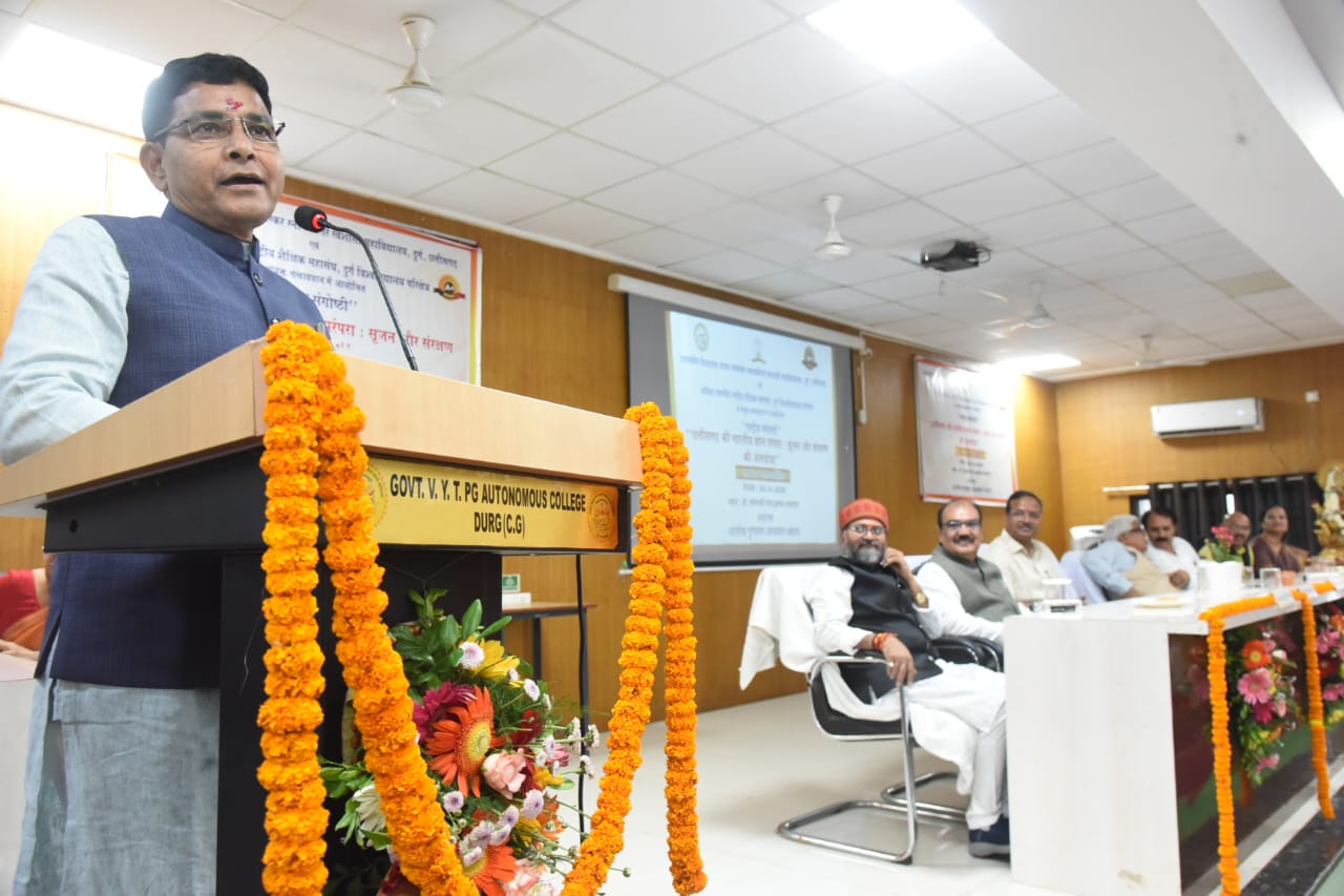 दुर्ग / छत्तीसगढ़ की भारतीय ज्ञान परंपरा-सृजन और संरक्षण की अंतर्यात्रा विषय पर राष्ट्रीय संगोष्ठी का कार्यक्रम आज शासकीय विश्वनाथ यादव तामस्कर स्नातकोत्तर स्वशासी महाविद्यालय के सभागार में आयोजित किया गया, जिसमें मुख्य अतिथि के रूप में राजस्व एवं आपदा प्रबंधन, पुनर्वास, उच्च शिक्षा मंत्री श्री टंक राम वर्मा शामिल हुए।