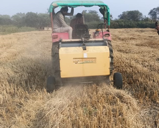 धान फसल कटाई पश्चात् खेत में बेलर मशीन से चारा संग्रहण कर रहे हैं किसान सोमेेश साहू