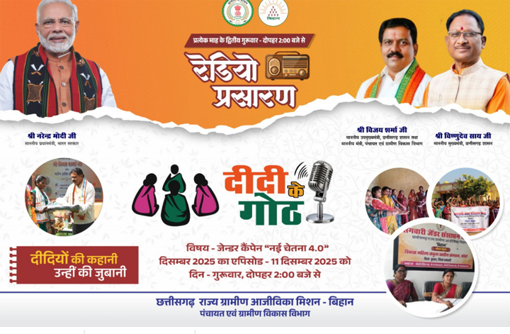 रायपुर।, छत्तीसगढ़ राज्य ग्रामीण आजीविका मिशन 'बिहान' का लोकप्रिय मासिक रेडियो कार्यक्रम 'दीदी के गोठ' के पंचम एपिसोड का प्रसारण होने जा रहा है। यह विशेष एपिसोड आज 11 दिसंबर को दोपहर 2 बजे आकाशवाणी के सभी केंद्रों से हिंदी एवं छत्तीसगढ़ी में प्रसारित होगा। वहीं दोपहर 2:30 बजे से जगदलपुर आकाशवाणी केंद्र से बस्तरिया में तथा अंबिकापुर आकाशवाणी केंद्र से सरगुजिया भाषा में इसका प्रसारण किया जाएगा।