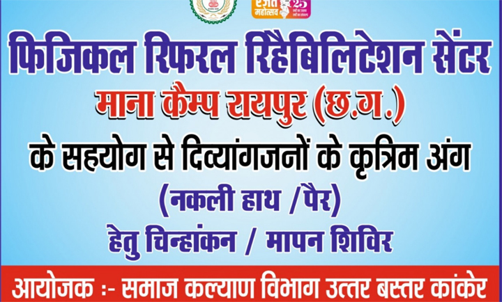 रायपुर । समाज कल्याण विभाग की महत्वपूर्ण पहल के तहत कांकेर जिले में दिव्यांगजनों के लिए कृत्रिम अंग (हाथ-पैर) प्रदान करने हेतु व्यापक चिन्हांकन एवं मापन शिविर का सफल आयोजन किया गया। फिजिकल रेफ़रल रिहैबिलिटेशन सेंटर रायपुर और समाज कल्याण विभाग कांकेर के संयुक्त तत्वावधान में आयोजित यह शिविर दिव्यांगजनों को अधिक सक्षम, आत्मनिर्भर और दैनिक जीवन में सहज गतिशीलता प्रदान करने के उद्देश्य से आयोजित किया गया।
