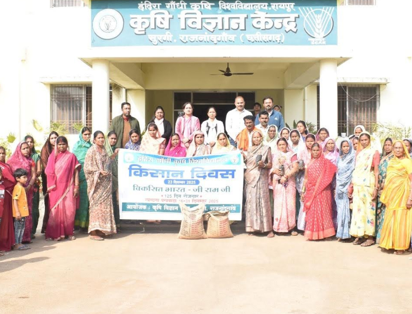 राजनांदगांव । इंदिरा गांधी कृषि विश्वविद्यालय के मार्गदर्शन में कृषि विज्ञान केन्द्र राजनांदगांव में अन्न उत्पादन में देश को आत्मनिर्भर बनाने वाले किसानों को समर्पित किसान दिवस कार्यक्रम आयोजित किया गया। कार्यक्रम में केन्द्रीय कृषि मंत्री श्री शिवराज सिंह चौहान का सीधा प्रसारण किया गया। कार्यक्रम में विकसित भारत जी-राम-जी योजना के संबंध में किसानों को जानकारी प्रदान की गई।