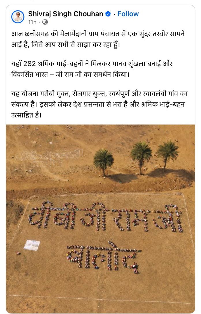 बालोद/ केन्द्रीय ग्रामीण विकास मंत्री श्री शिवराज सिंह चैहान ने बालोद जिले के गुरूर विकासखण्ड के ग्राम पंचायत भेजा मैदानी में गत दिनों आम नागरिकों को ’वीबी जी राम जी’ योजना के महत्व एवं उद्देश्य की जानकारी देते हुए ग्रामीणों द्वारा बनाए गए मानव श्रृंखला के सुंदर तस्वीर को अपने ट्वीटर एकाउंट के माध्यम से ट्वीट किया है। अपने ट्वीट में श्री चैहान ने लिखा है कि छत्तीसगढ़ की भेजा मैदानी ग्राम पंचायत में एक सुंदर तस्वीर सामने आई है, जिसे मैं आप सभी को साझा कर रहा हूँ। यहाँ 282 श्रमिक भाई-बहनों ने मिलकर मानव श्रृंखला बनाई और ’विकसित भारत जी राम जी’ का समर्थन किया। यह योजना गरीबी मुक्त, रोजगार मुक्त, स्वयंपूर्ण और स्वालंबी गांव का संकल्प है। इसको लेकर देश प्रसन्नता से भरा है और श्रमिक भाई बहन उत्साहित है।