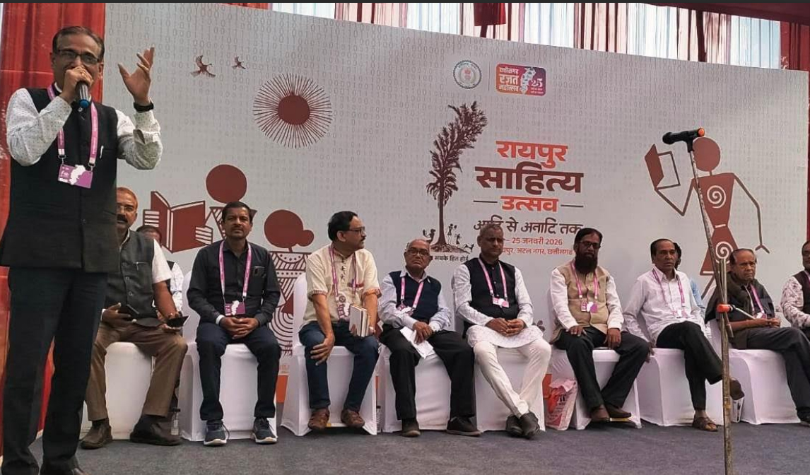 राजनांदगांव । राजधानी रायपुर में जनसंपर्क विभाग एवं साहित्य अकादमी-रायपुर द्वारा आयोजित तीन दिवसीय रायपुर साहित्य उत्सव के बहुरंगी विमर्शमयी वातावरण में राजनांदगांव जिले ने भी रेखांकनीय भागीदारी निभाकर यहां कि सृजनधर्मी परम्पराओं का सफल निर्वाहन किया। 23 से 25 जनवरी 2026 तक अटल नगर नया रायपुर के पुरखौती मुक्तांगन में आयोजित इस साहित्योत्सव में एक ओर विशाल पंडालों में अलग अलग विषयों पर ख्यातिनाम लेखकों, साहित्यकारों, कवियों और संस्कृतिकर्मियों द्वारा विमर्श होते रहे, तो दूसरी ओर छत्तीसगढ़ लोकसंस्कृति, पुस्तक प्रदर्शनी, ओपन माइक, पारम्परिक व्यंजन के स्टॉल जनमानस के आकर्षण का केन्द्र रहे। संस्कारधानी राजनांदगांव के रचनाकारों ने इसमें शिरकत कर उत्सव का न केवल आनंद उठाया बल्कि संस्कारधानी का प्रतिनिधित्व भी किया।