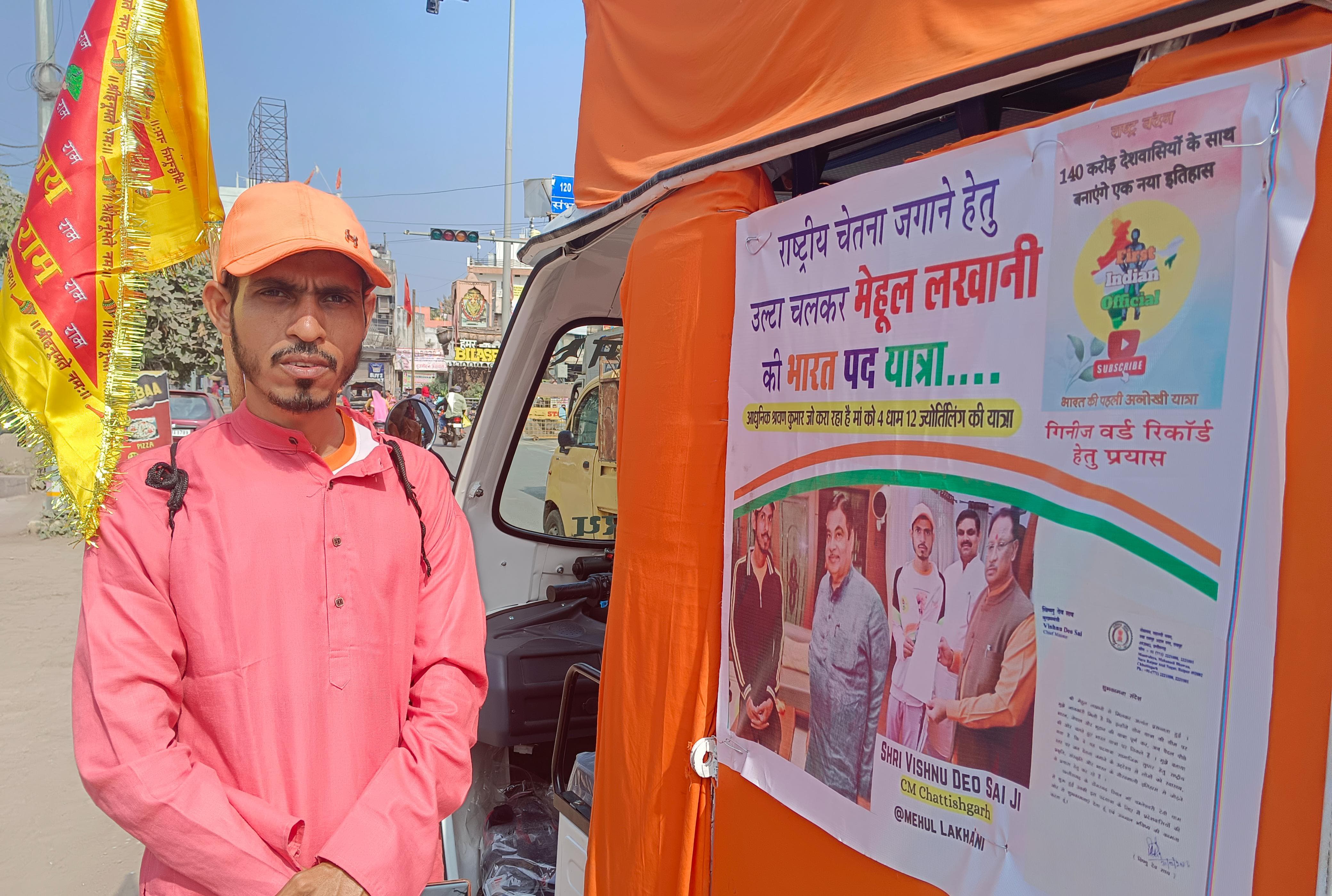 बिलासपुर के सीपत चौक पहुंचे मेहुल लखानी एक अनूठी यात्रा पर निकलें है। उनकी यात्रा पैदल चलते हुए डोंगरगढ़ से प्रभु श्री राम के धाम अयोध्या तक पहुंचना है। मेहुल ने बताया कि रायपुर पहुंचने पर मुख्यमंत्री श्री विष्णुदेव साय ने भी उन्हें अपनी शुभकामनाएं दी है। मेहुल का कहना है कि वे उल्टे चल कर समाज में चेतना का प्रयास कर रहें है और राष्ट्रीय चेतना जगाने के लिए ये पद यात्रा शुरू की गई है। उन्होंने छत्तीसगढ़ सरकार की रामलला दर्शन योजना की सराहना करते हुए कहा कि इससे श्री राम के प्रति आस्था रखने वाले सामान्य परिवार के लोग भी श्री राम मंदिर का दर्शन कर पुण्य लाभ कमा पाएंगे।