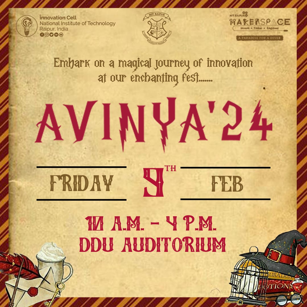 रायपुर ।राष्ट्रीय प्रौद्योगिकी संस्थान रायपुर के इनोवेशन सेल (आई सेल) के द्वारा इनोवेशन को बढ़ावा देने के लिए एकदिवसीय मुख्य कार्यक्रम ‘अविन्या’ का आयोजन दिनांक 09 फरवरी 2024 को दीनदयाल उपाध्याय ऑडिटोरियम में किया जाएगा। टीम इनोवेशन सेल ने अपने इस फ्लैगशिप इवेंट की थीम 'मैजिक ऑफ साइंस - अनलॉक द चैंबर ऑफ सीक्रेट्स' रखी है। कार्यक्रम का आयोजन इनोवेशन सेल के फैकल्टी इन चार्ज डॉ. सौरभ गुप्ता के मार्गदर्शन में किया जाएगा।