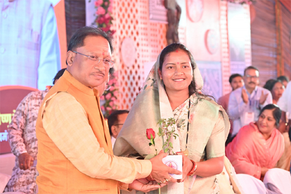 - मुख्यमंत्री का महिला एवं बाल विकास मंत्री श्रीमती लक्ष्मी राजवाड़े ने तुलसी का पौधा भेंटकर कार्यक्रम स्थल पर किया स्वागत