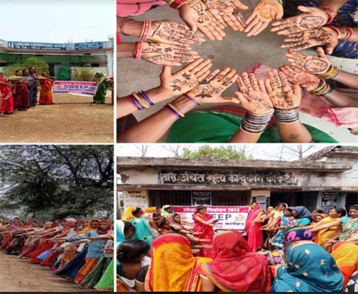 राजनांदगांव । कलेक्टर एवं जिला निर्वाचन अधिकारी श्री संजय अग्रवाल के मार्गदर्शन में लोकसभा निर्वाचन 2204 अंतर्गत राजनांदगांव जिले में 26 अप्रैल 2024 को शत-प्रतिशत मतदान के लिए स्वीप अंतर्गत मतदाताओं को मतदान के लिए जागरूक एवं प्रेरित किया जा रहा है। जिला पंचायत सीईओ सुश्री सुरूचि सिंह के निर्देशन में बिहान योजना अंतर्गत समूह की महिलाएं अपने-अपने ग्राम संगठन एवं संकुल संगठन स्तर पर शत-प्रतिशत मतदान के लिए ग्रामीणों को जागरूक कर रहीं है। अविभाजित राजनांदगांव जिले के सभी 9 विकासखंड अंतर्गत अब तक लगभग 650 ग्राम संगठनों से जुड़े लगभग 1 लाख से अधिक स्वसहायता समूह की महिला सदस्यों द्वारा मतदाता जागरूकता कार्यक्रम किया गया है और आगे भी ग्रामीणों को मतदान के लिए जागरूक करने का कार्य कर रहीं है। कार्यक्रम के दौरान समूह की महिलाओं द्वारा रैली निकालकर, हांथों में मेंहदी लगाकर, रंगोली, मानव श्रृंखला बनाकर शत-प्रतिशत मतदान के लिए ग्रामीणों से अपील करते हुए जागरूकता किया जा रहा है। विशेष रूप से महिलाओं द्वारा ग्राम संगठन स्तर पर समूह की महिलाओं से मतदान वचन का शपथ भी दिलाया जा रहा है। साथ ही अपने परिवार, रिश्तेदारों एवं पड़ोसियों को मतदान करने प्रेरित करने कहा जा रहा है। इस प्रकार से ग्रामीण अंचल में बिहान स्वसहायता समूह की महिलाओं द्वारा मतदाता जागरूकता हेतु अभिनव प्रयास किया जा रहा है, जिससे जिले में शत-प्रतिशत मतदान का लक्ष्य प्राप्त किया जा सके।
