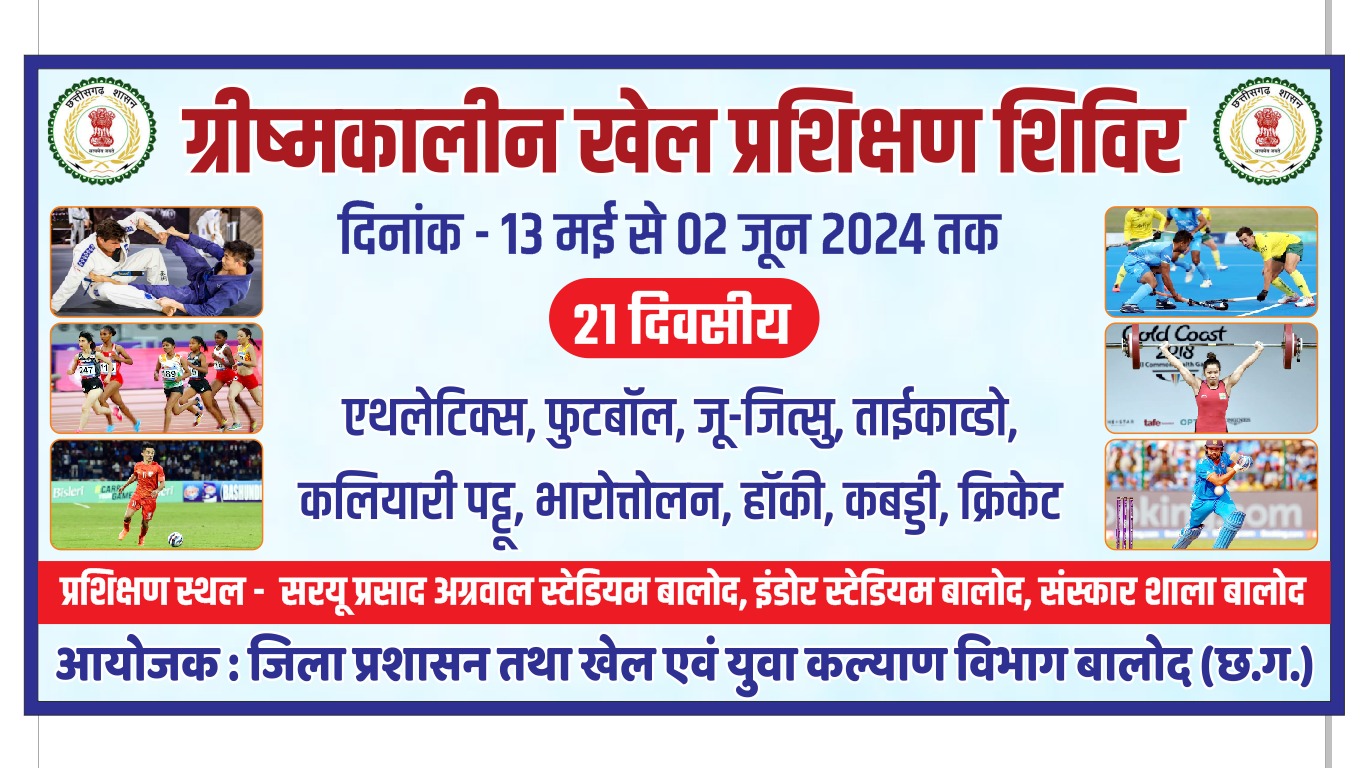 ग्रीष्मकालीन खेल प्रशिक्षण शिविर का उद्घाटन 13 मई को सरयू प्रसाद अग्रवाल स्टेडियम बालोद में किया जाएगा। प्रशिक्षण शिविर में शामिल होने के लिए सब जूनियर, जूनियर वर्ग की बालक-बालिकाओं को निर्धारित प्रारूप में आवेदन (पासपोर्ट फोटो सहित) निर्धारित प्रशिक्षण स्थल या खेल एवं युवा कल्याण विभाग के कार्यालय में जमा करना होगा। प्रशिक्षण शिविर में अभ्यास का समय प्रातः काल और संध्याकाल में दो-दो घंटे का होगा।