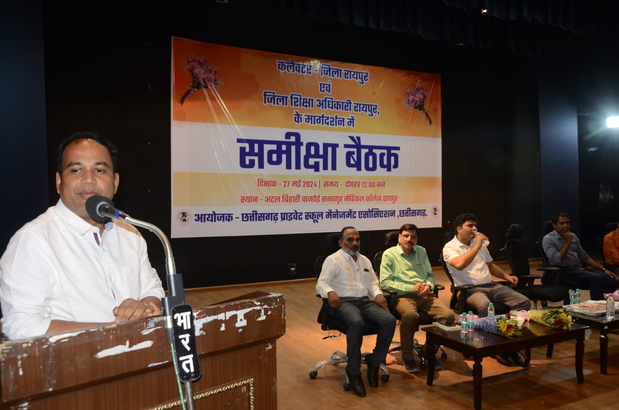 रायपुर । कलेक्टर डाॅ. गौरव सिंह ने आज मेडिकल काॅलेज स्थित हाॅल में निजी स्कूल संचालकों और नोडल प्राचार्य की बैठक ली। कलेक्टर डाॅ. सिंह ने बैठक को संबोधित करते हुए कहा कि आरटीई का पालन करना पहली प्राथमिकता है। अनिवार्य रूप से इसका पालन किया जाए। इस अधिनियम के तहत स्कूलों में अध्ययनरत बच्चों को अच्छी शिक्षा दें, जिससे वे निरंतर आगे बढ़े। यह ऐसे बच्चे है, जिनका ऐसे स्कूलों में पढ़ना एक सपना रहता है, जो शिक्षा के अधिकार से पूरा हो रहा है, इस कार्य में उनकी अवश्य मदद करें। इस अवसर पर नगर निगम आयुक्त श्री अबिनाश मिश्रा सहित शिक्षा विभाग के अधिकारीगण उपस्थित थे।