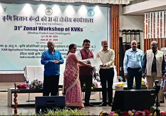 राजनांदगांव । भारतीय कृषि अनुसंधान परिषद-कृषि प्रौद्योगिकी अनुसंधान संस्थान जोन-9 जबलपुर एवं इंदिरा गांधी कृषि विश्वविद्यालय रायपुर के संयुक्त तत्वावधान में मध्यप्रदेश एवं छत्तीसगढ़ के 81 कृषि विज्ञान केन्द्रों की तीन दिवसीय 31वीं क्षेत्रीय कार्यशाला का आयोजन इंदिरा गांधी कृषि विश्वविद्यालय रायपुर में किया गया। कार्यशाला में विभिन्न कृषि विज्ञान केन्द्रों द्वारा लगाई गई कृषि प्रदर्शनी के लिए छत्तीसगढ़ एवं मध्यप्रदेश के विभिन्न कृषि विज्ञान केन्द्रों को पुरस्कृत किया गया। कार्यशाला में कृषि विज्ञान केन्द्र राजनांदगांव द्वारा छत्तीसगढिय़ा मशरूम उत्पादक एवं हिन्दुस्तान किसान उत्पादक संघ अर्जुनी के उत्पादों का स्टॉल लगाकर प्रदर्शन किया गया था। जिसके लिए उत्कृष्ट प्रदर्शनी स्टॉल लगाने के लिए राजनांदगांव के स्टॉल को सम्मानित किया गया।