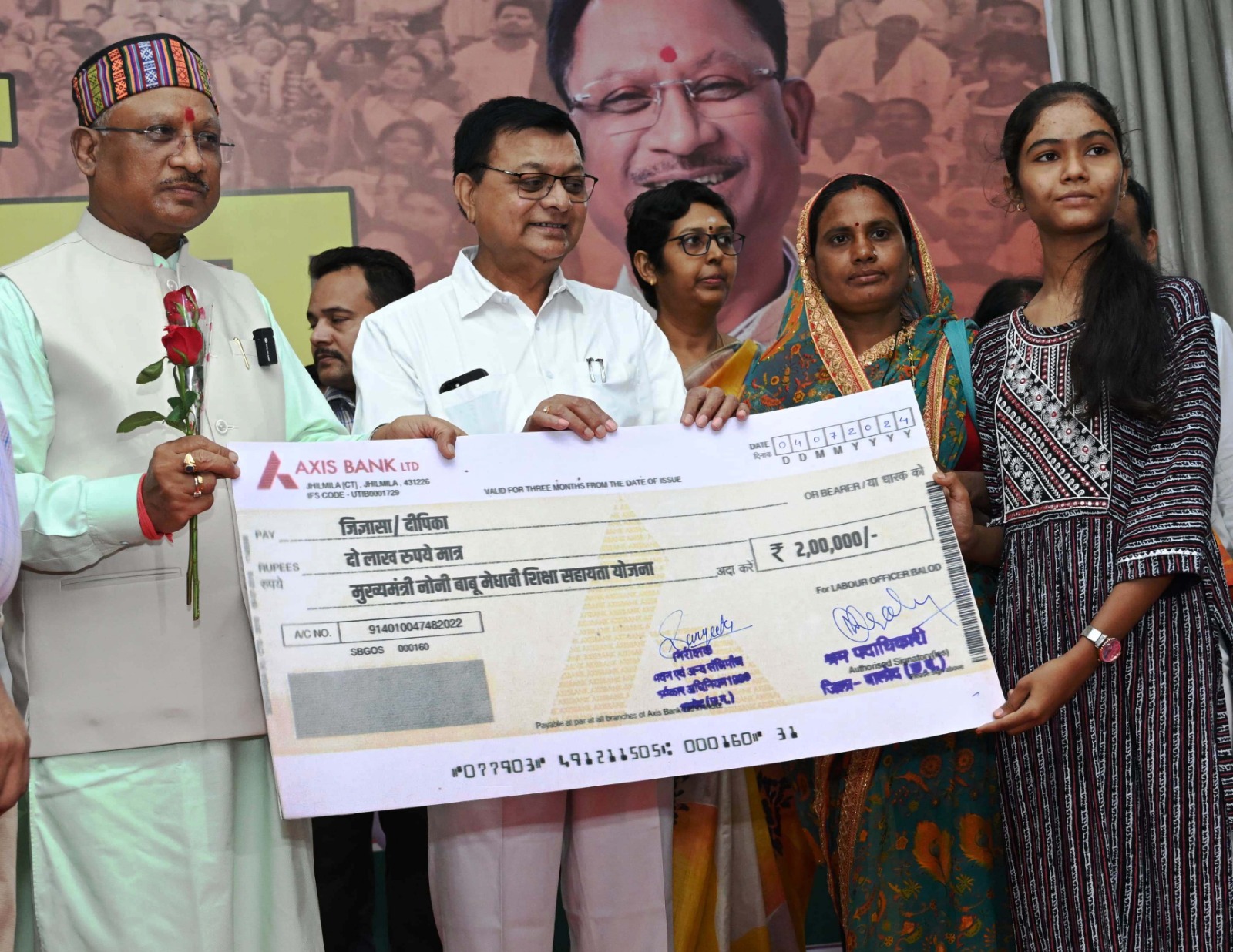 रायपुर / मुख्यमंत्री श्री विष्णु देव साय ने आज जनदर्शन कार्यक्रम के दौरान अपने निवास कार्यालय में श्रम विभाग के अंतर्गत पंजीकृत श्रमिकों के मेधावी बच्चोें को दो-दो लाख रूपए की राशि का चेक प्रदान किया। इसमें मुख्यमंत्री नोनी-बाबू मेधावी शिक्षा सहायता योजना के अंतर्गत दी जाने वाली प्रोत्साहन राशि एक लाख रूपए तथा स्कूटी क्रय के लिए दी जाने वाली एक लाख रूपए का चेक मुख्यमंत्री ने प्रदान किया। अवसर पर प्रदेश के श्रम मंत्री श्री लखनलाल देवांगन सहित मेधावी बच्चों के अभिभावक विशेष रूप से उपस्थित थे।