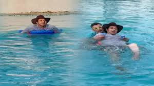 सहारा लेकर स्विमिंग करते दिखे धर्मेंद्र .......