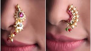 यह नथ पारंपरिक महाराष्ट्रीयन लुक को और आकर्षक बनाती है। नथ में लगे हरे रंग के पत्थर और लटकते हुए हरे मनके इसे शाही और रंगीन बनाते हैं। नथ का अर्धचंद्राकार डिजाइन चेहरे को खूबसूरत बनाता है।