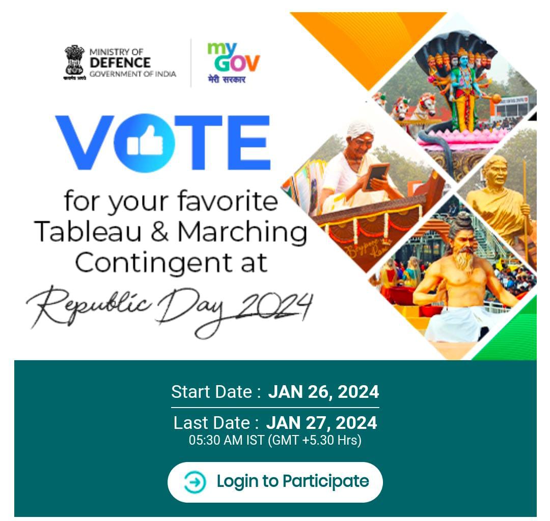 परेड में शामिल विभिन्न राज्यों की झांकियों के बारे में आम-नागरिकों की राय लेने के लिए रक्षा मंत्रालय ने आज एक पोल की शुरुआत की है। इसकी समय-सीमा कल 27 जनवरी को शाम 5.30 बजे तक है। सभी नागरिकों से अनुरोध है कि कृपया छत्तीसगढ़ की झांकी के संदर्भ में अपनी राय अवश्य देवें।