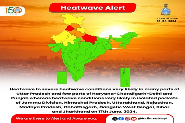 नई दिल्ली। मौसम विभाग ने पंजाब, हरियाणा, उत्तर प्रदेश, बिहार, पश्चिम बंगाल और असम में आज भीषण गर्मी और लू का रेड अलर्ट जारी किया है। उत्तर प्रदेश, पंजाब, बिहार, झारखंड, उत्तराखंड, मध्य प्रदेश, छत्तीसगढ और पश्चिम बंगाल के विभिन्न हिस्सों तथा हरियाणा, चंडीगढ़, दिल्ली, जम्मू, हिमाचल प्रदेश और राजस्थान में कल तक भीषण गर्मी जारी रहेगी।
