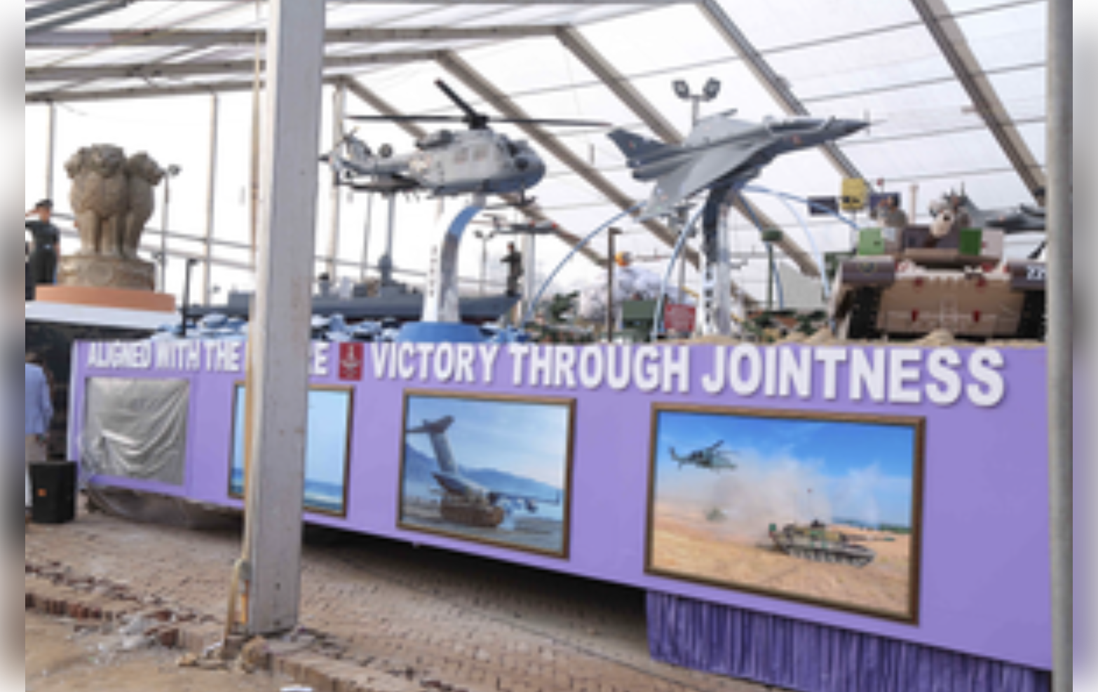 युद्धक्षेत्र में थल सेना का स्वदेशी मुख्य युद्धक अर्जुन टैंक, वायुसेना का तेजस एमकेआईआई लड़ाकू विमान, उन्नत हल्के हेलीकॉप्टर, नौसेना का विध्वंसक आईएनएस विशाखापत्तनम और दूर से संचालित विमान एक साथ जमीन, पानी और हवा में एक सिंक्रोनाइज ऑपरेशन का प्रदर्शन करते हुए दिखाई देंगे। यह संयुक्त झांकी युद्ध क्षेत्र में भारतीय सेनाओं के तालमेल को दर्शाती है।