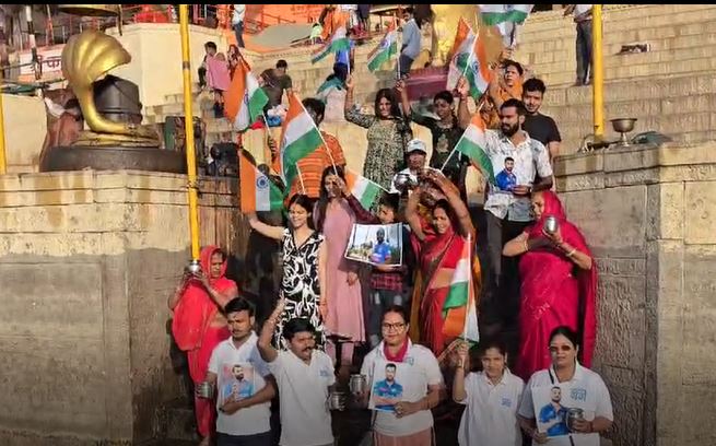 काशी के घाटों पर रंगोली बनाकर टीम इंडिया के जीत के लिए की गई गंगा आरती और दुग्धाभिषेक