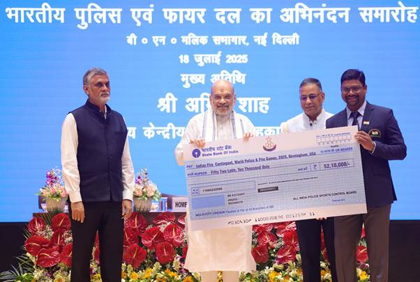 नई दिल्ली। केन्द्रीय गृह मंत्री अमित शाह ने शुक्रवार को ‘21वें विश्व पुलिस एवं फायर खेल-2025’ में 613 पदक विजेताओं और भारतीय दल को नई दिल्ली में आयोजित अभिनन्दन समारोह को संबोधित किया। केन्द्रीय गृह मंत्री ने भारतीय दल को 613 मेडल जीतने पर प्रसन्नता करते हुए शानदार प्रदर्शन कर भारत को गौरवान्वित करने के लिए भारतीय पुलिस एवं अग्निशमन दल को बधाई दी। उन्होंने कहा कि अगला विश्व पुलिस एवं अग्निशमन खेल भारत में होगा।