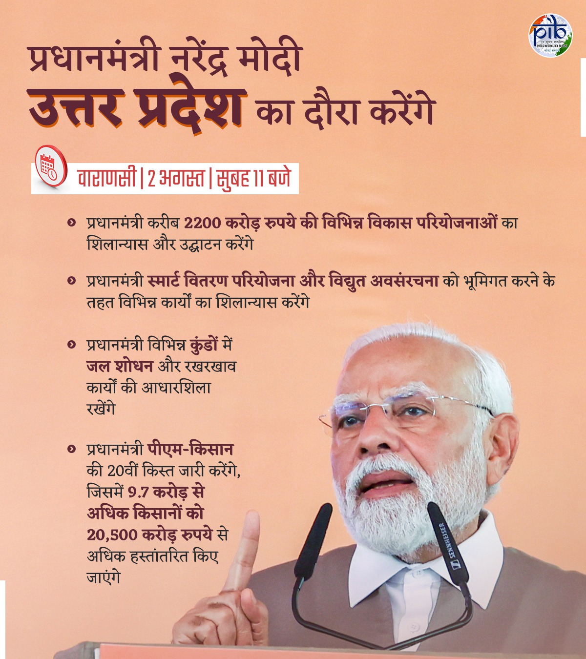 नई दिल्ली। प्रधानमंत्री नरेन्द्र मोदी आज वाराणसी से किसान सम्मान निधि की 20वीं किस्त जारी करेंगे। वे 2200 करोड़ रुपये की 52 विकास परियोजनाओं का उद्घाटन और शिलान्यास भी करेंगे। इस अवसर पर श्री मोदी जनसभा को भी संबोधित करेंगे।